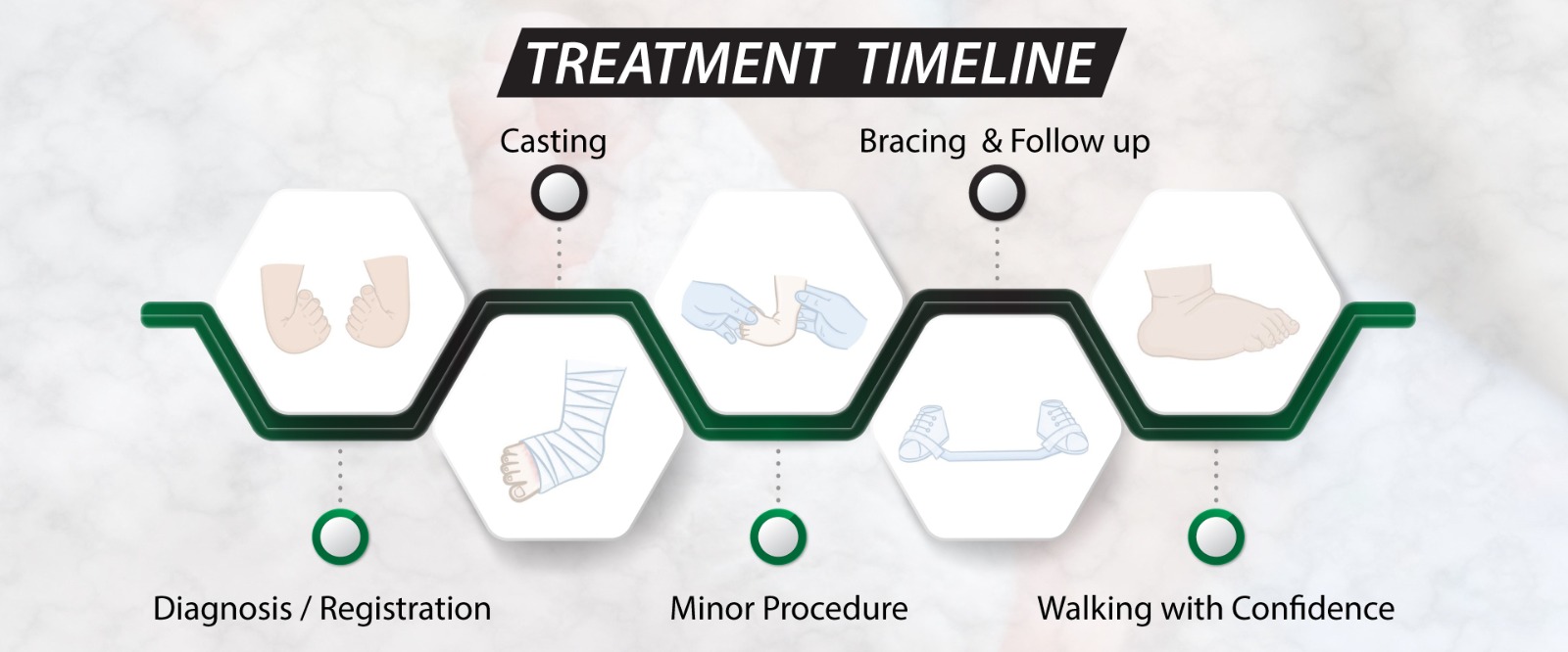 Treatment begins within the first few weeks after birth, when a baby’s bones and tendons are still soft and flexible. Early care gives the best long-term results and helps the child walk normally.